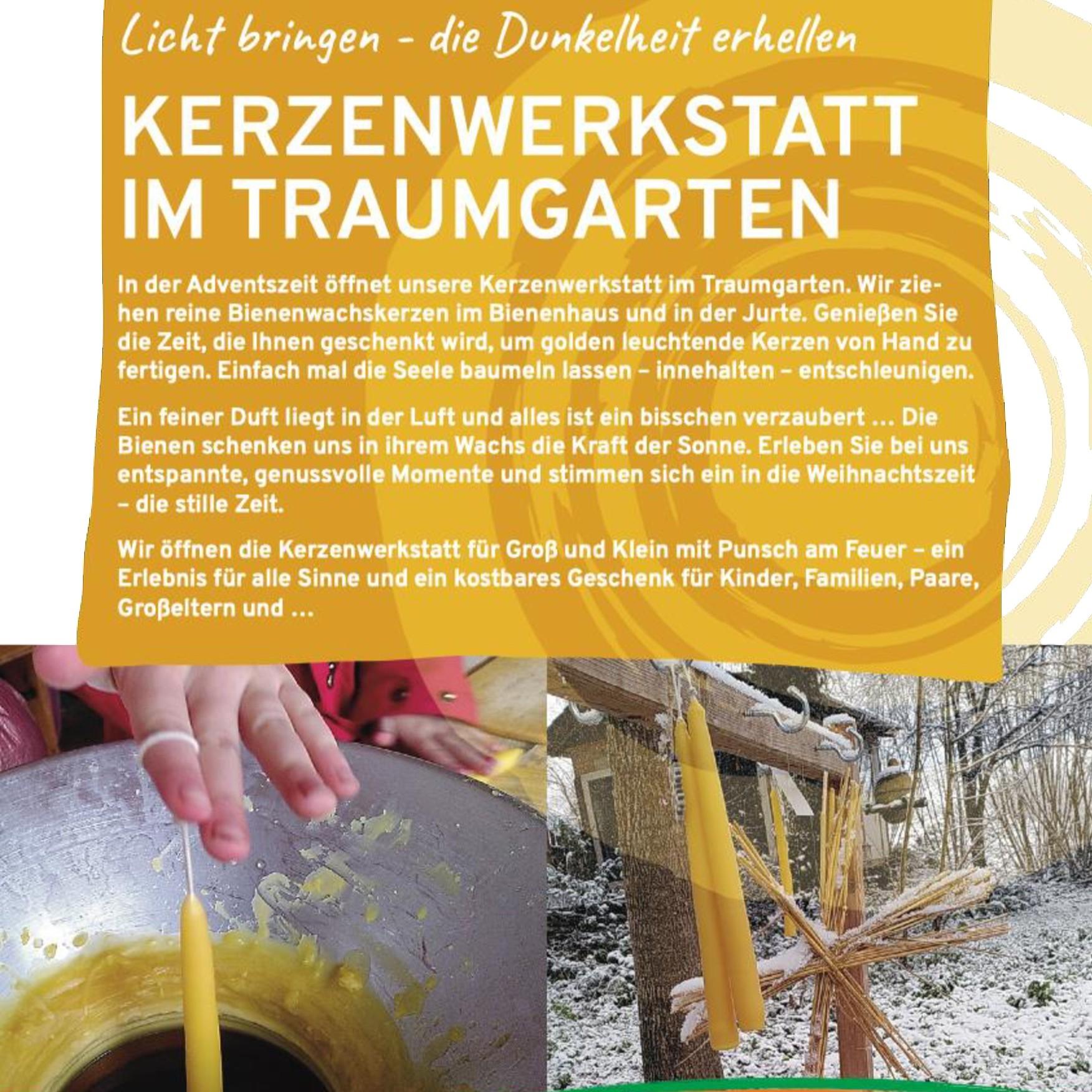Licht bringen - die Dunkelheit erhellen. In der Adventszeit öffnet unsere Kerzenwerkstatt im Traumgarten. Wir ziehen reine Bienenwachskerzen im Bienenhaus ...
